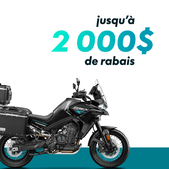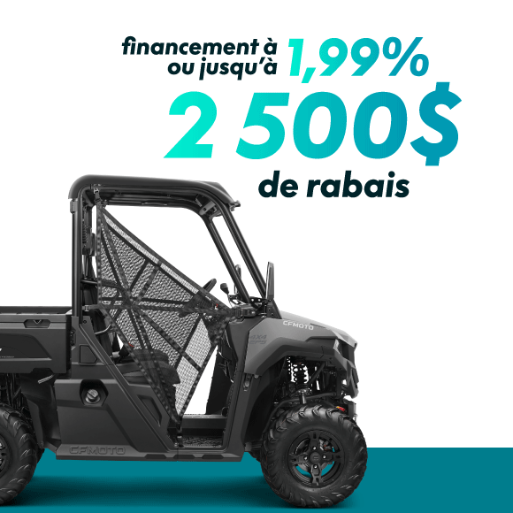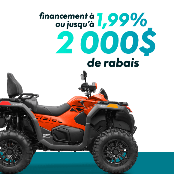 Le financement à 5.99% sur 60 mois peut être combiné aux rabais et est disponible pour les modèles 2026 et antérieurs. Un exemple de paiement mensuel avec 0 $ d'acompte, sans remise, un TAP de 3.99 % sur 72 mois à un PDSF de 13 999 $ est de 218.96$/mois. Coût total d'emprunt 1 766.12 $ avec une obligation de remboursement totale de 15 765.12 $. Un acompte peut être exigé et d'autres offres de financement peuvent être disponible. Les montants financés peuvent varier et d'autres qualifications et restrictions peuvent s'appliquer. Tous les acheteurs ne seront pas éligibles. Ni CFMOTO Canada ni ses filiales ou sociétés affiliées ne peuvent être tenues responsables des prêts consentis par Financement Auto TD ou Santander Consumer relativement à cette offre. Cette offre de financement est soumise aux critères de crédit courants de Financement Auto TD ou Santander Consumer. CFMOTO Canada n'est responsable d'aucune des modalités et conditions de financement.