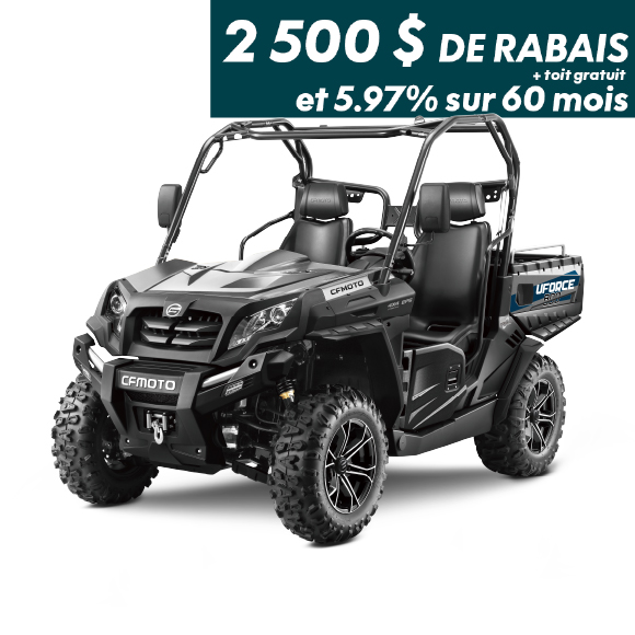 Le prix spécial du UFORCE 800 à 9 999$ n’inclut pas les taxes, la surcharge de commodité, les frais de transport et les frais de préparation. Le prix du UFORCE 800 à 11 749$ inclut le PDSF de 9 999$, la surcharge de commodité de 550$, les frais de transport de 700$ et les frais de préparation de 500$. Le prix régulier du UFORCE 800 2023 est de 16 499$ et celui du UFORCE 800 2022 est de 15 499$, et n’inclut pas la surcharge de commodité, les frais de transport et les frais de préparation. Le toit gratuit du UFORCE 800 est le numéro de pièce 703A-260200 et a une valeur de 600.99$.